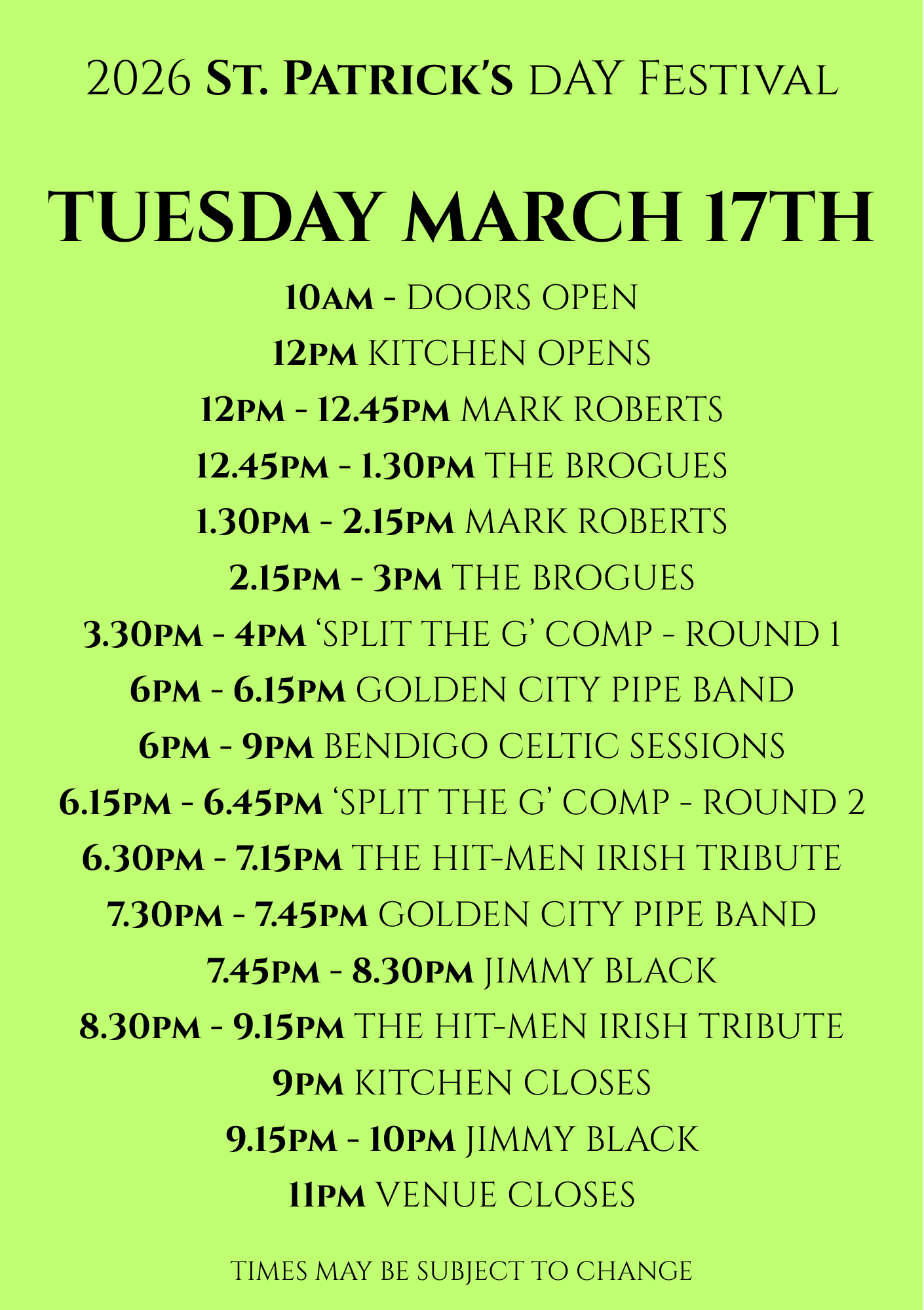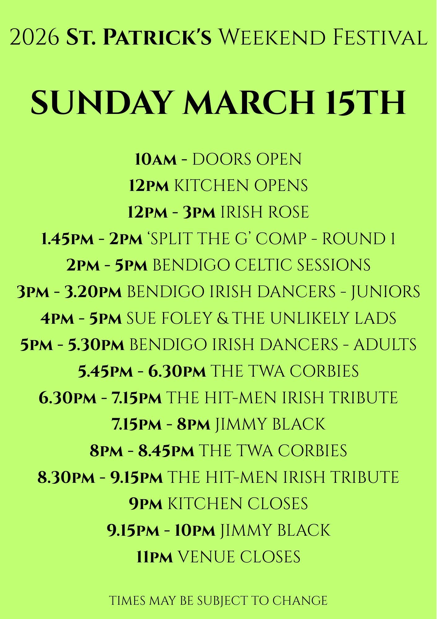 Sunday March 15th 2026 – St. Patrick’s Day (PRE) Festival FREE ENTRY